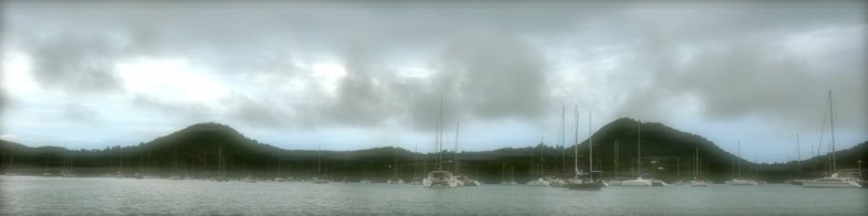 Non, c'est juste qu'il pleut. Non vraiment. Presque sans discontinuer depuis notre arrivée samedi soir. La Martinique ne nous aime pas, elle raboule les nuages dès qu'elle aperçoit Namasté. Hey les gars, venez me laver ce bicoque, sa reine et son pêcheur, attention à pas trop faire rouiller sa couronne (et non ma couronne n'est pas en or mais tout juste en ferraille peinte en jaune, elle fait quand même bien la blague comme on dit dans les milieux autorisés qui s'autorisent à penser à ma couronne),