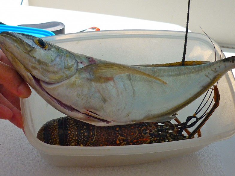 Jusqu’à ce jour où …. Je peux attester du coup de la ‘poker face’ dont parlait sa Majesté il y a quelques posts. Je confirme !!! il nous a fait le coup là aussi ! avant de lever ses palmes et de dévoiler un beau poisson (exquis en sashimi à l’apéro, mariné au citron vert, j’en salive encore…). Mais sous le beau poisson, il y avait une jolie surprise qui m’a oté tout désir de me moquer du Chef : une langouste ! Si, si, je vous jure.