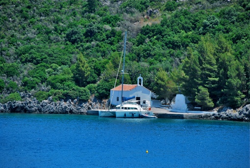 Le spot où nous étions amarrés est atypique. Il s’agit d’un quai minuscule de 3 places, avec simplement une chapelle. Un chemin de terre relie ce lieu au village après 30 mn de marche dans la pinède et le long de la mer.